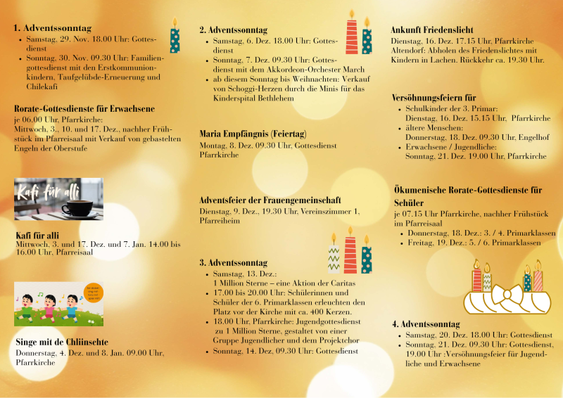 Unsere Advents- und Weihnachtsanlässe, per Druck-Datum 7.11.2025, finden sich auf unserem neuen Flyer. Diese liegen in Papierform hinten in der Kirche auf und werden den Schulkindern im Religionsunterricht abgegeben.